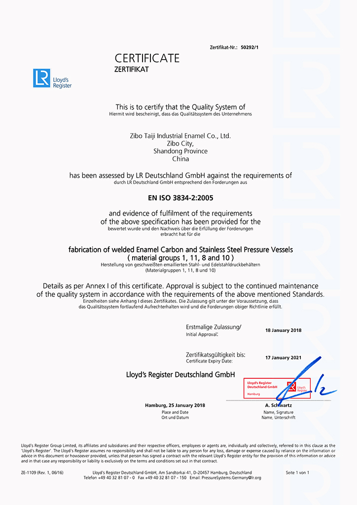 淄博太極在中國搪玻璃設備制造行業中首家通過ISO90001質量體系認證,并擁有美國ASME認證、歐洲PED認證以及國家部門頒發的搪玻璃制造許可證、進出口許可證和百余項榮譽證以及三十六項專利等。